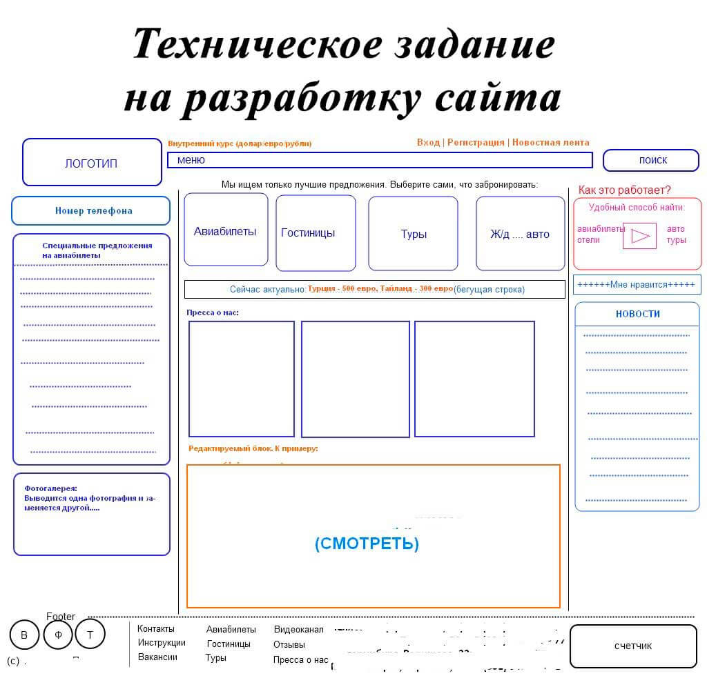 Техническое задание на разработку сайта – это самая важная часть процесса создания сайта. Развитие технического прогресса не стоит на месте. Все больше покупок товаров и услуг люди делают именно в интернете. Это существенно экономит время, ведь для того чтоб купить джинсы или путевку нет необходимости бегать днем по магазинам или агентствам, ведь можно вечером, сидя за компьютером проделать те же манипуляции и обзавестись товаром. Каждая уважающая фирма, будь это турагентство, магазин или информационный портал, стремятся к тому, чтоб создать свой сайт, который станет одним из мощнейших инструментов продаж.