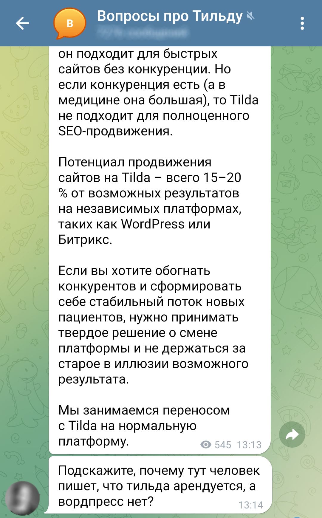 В одной из групп в телеграмме человек написал, что ему предложили сайт на Тильде перенести в Вордпресс. Что Тильда неполноценная система и для продвижения не подходит. Подробнее можно прочитать на скрине.